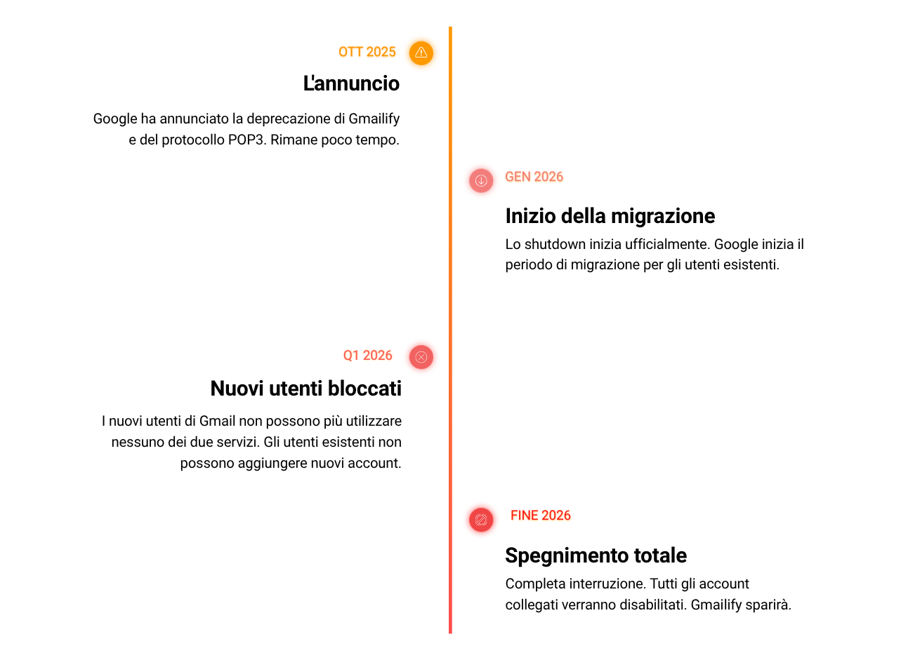 Durante il primo trimestre del 2026, nuovi utenti di Gmail vengono bloccati dall'utilizzare i due servizi e non possono essere aggiunte nuove email, nemmeno per gli utenti attuali. Google inizia a disabilitare gli account connessi per gli utenti attuali in lotti. E con la completa interruzione di Gmailify e della funzione "Verifica la posta da altri account" di Gmail alla fine del 2026, gli utenti si vedranno costretti a passare al forward email o utilizzare un client email completo il prima possibile.