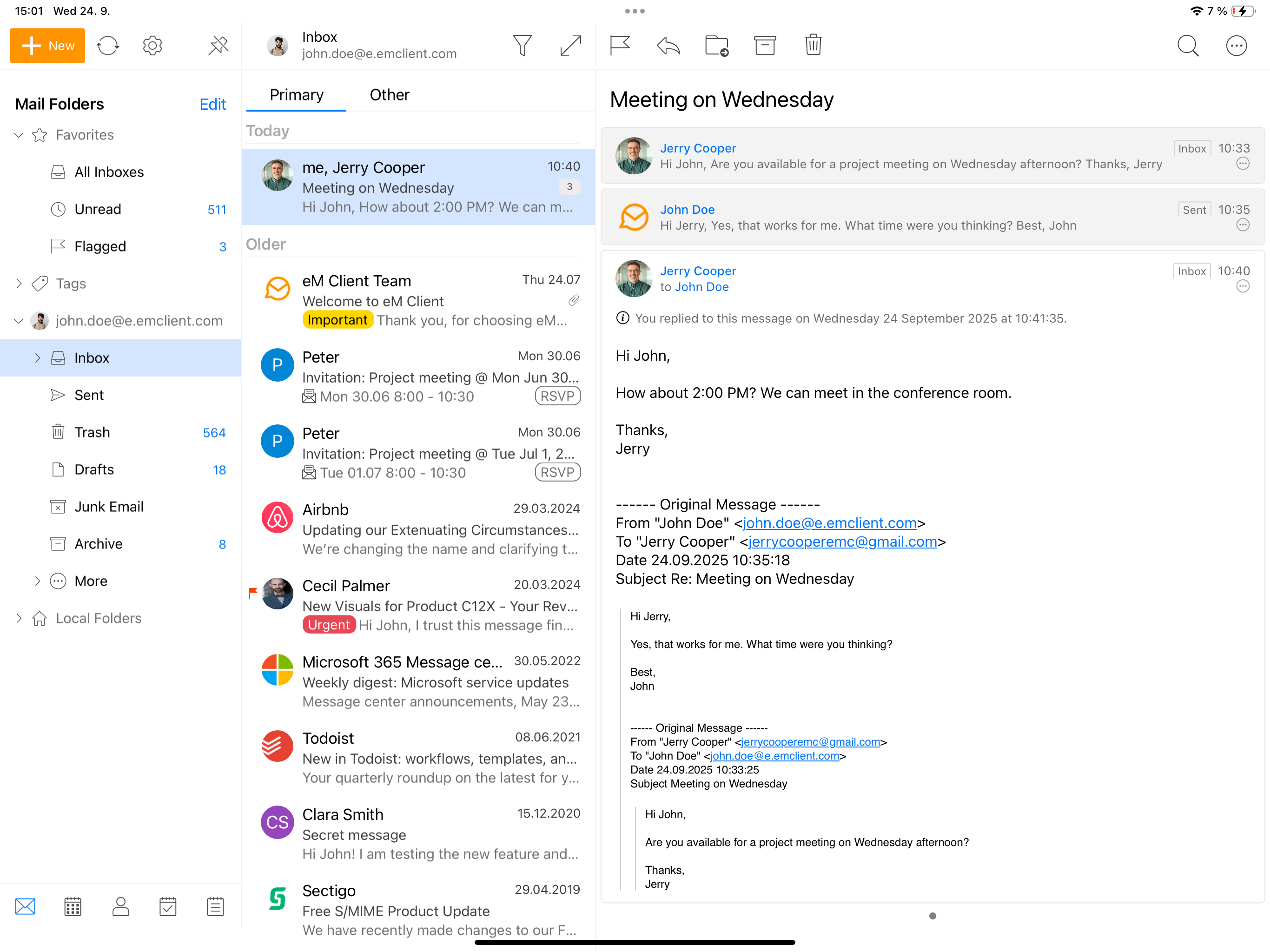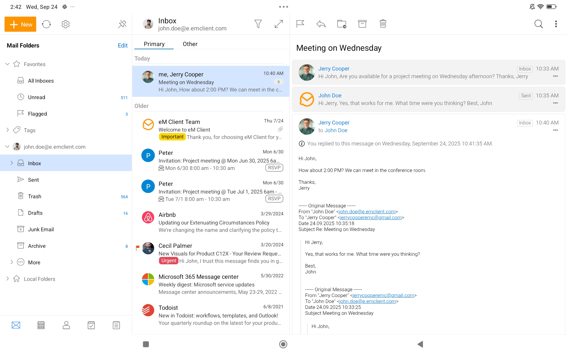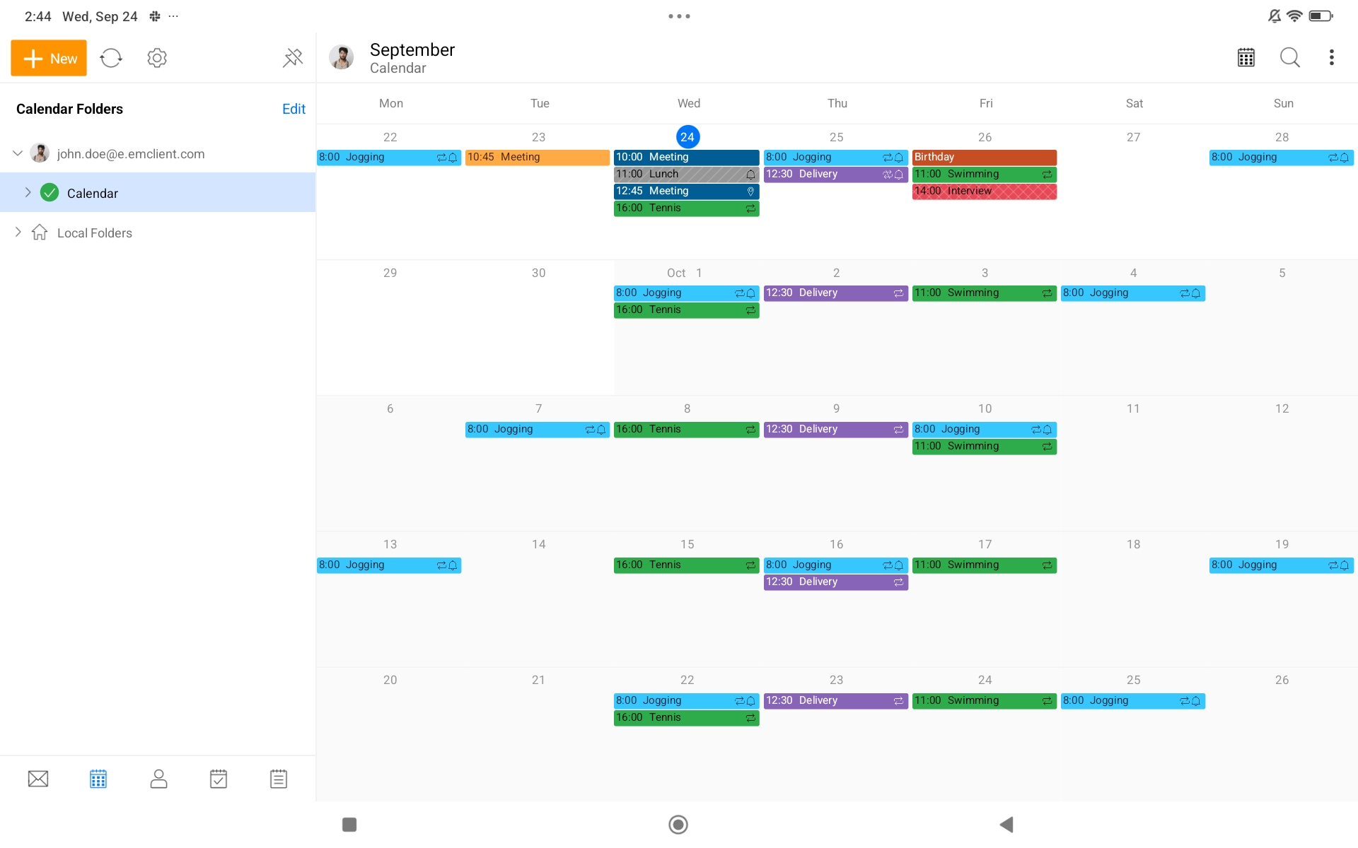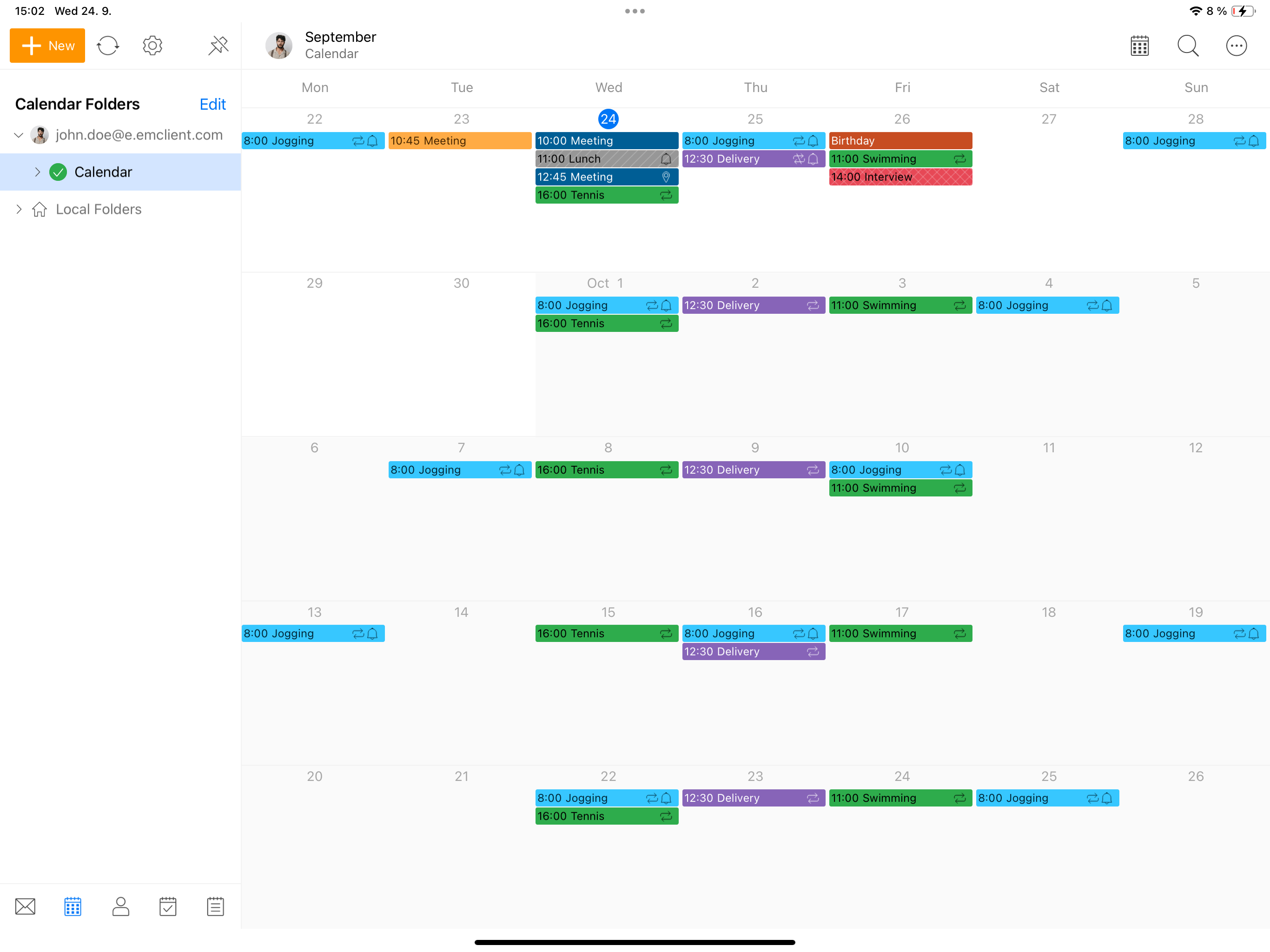 L'app mobile eM Client offre ora il supporto completo per calendari locali e sincronizzati, mantenendo i tuoi eventi e i tuoi programmi a portata di mano ovunque tu sia. Puoi accettare inviti alle riunioni direttamente dai messaggi, o creare nuovi appuntamenti ed esplorare la tua agenda in diversi layout, tra cui settimana, mese, visualizzazione agenda e una speciale visualizzazione di tre giorni per un rapido accesso a ciò che ti aspetta.