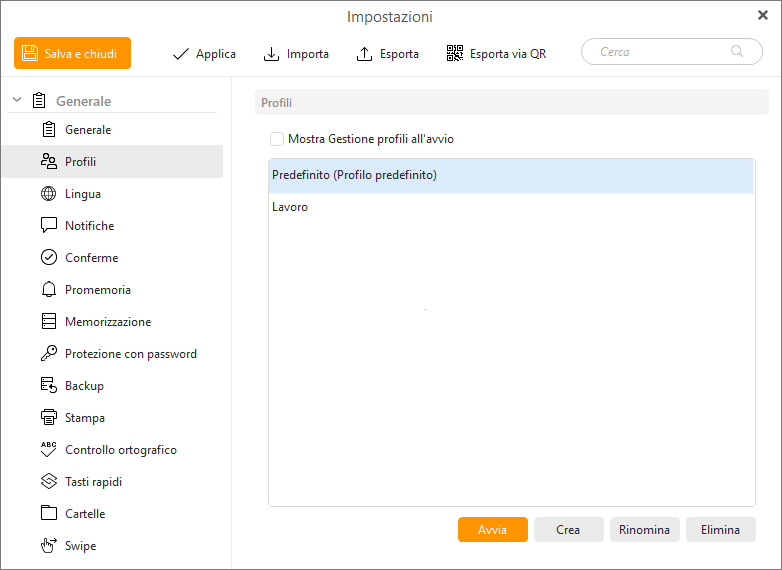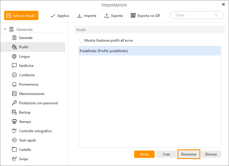 Se desideri che il gestore profili venga visualizzato ogni volta che avvii l'app, attiva l'opzione “Mostra gestore profilo all'avvio” in Impostazioni > Generale > Profili.