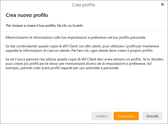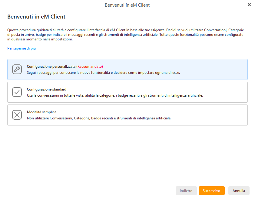 Se la cartella del profilo è stata creata da zero oppure è vuota, l’assistenza guidata di Benvenuto si attiva quando la esegui, proprio come la prima volta che hai installato eM Client: