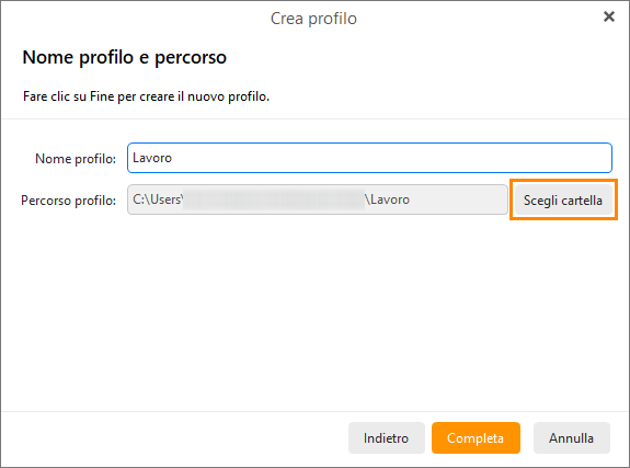 Dai un nome al tuo profilo e scegli la posizione del relativo database, dove i dati verranno memorizzati: