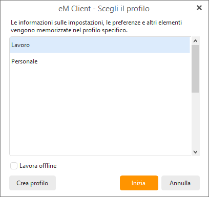 Questa funzione mostrerà una finestra di selezione del profilo ogni volta che viene avviato eM Client. Il pop-up include l'opzione per eseguire il profilo selezionato in modalità Offline: