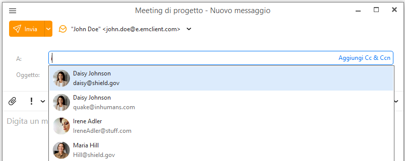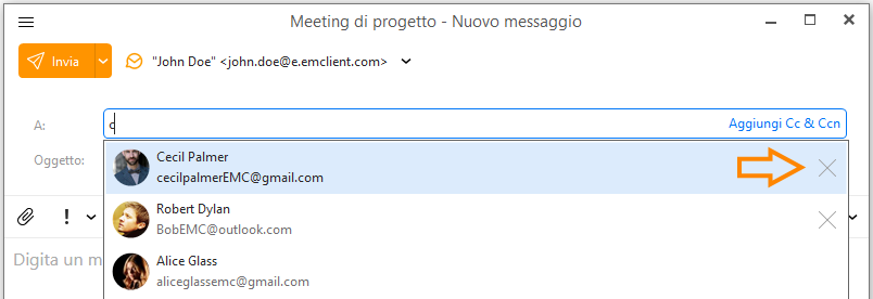 Per impostazione predefinita, l'app eM Client suggerisce gli indirizzi dai contatti, delle cartelle Inviati e
