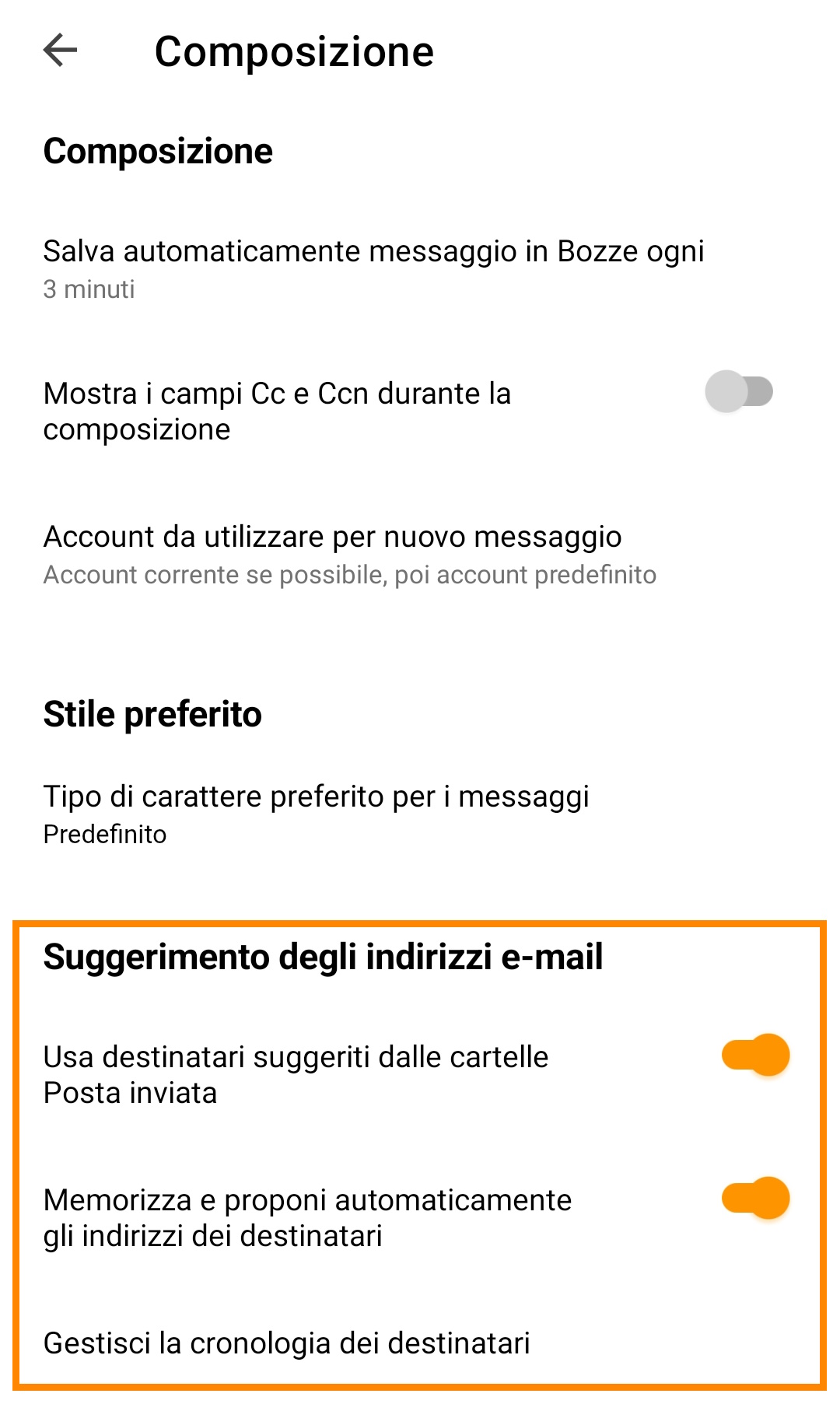 In alternativa, puoi accedere alle impostazioni di suggerimento degli indirizzi e-mail e fare